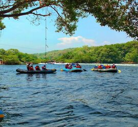 Boating is done in river Kali using rubber boats and boat ride in flowing river is just amazing experience to see panoramic view of Kali river during boating with expert guide. Boating at dandeli is one of the famous water sports. It allows you to get sweeping views of water and the beautiful view of nature. River Boating at Dandeli is Adventure and fun for your Family and Friends at River Kali.